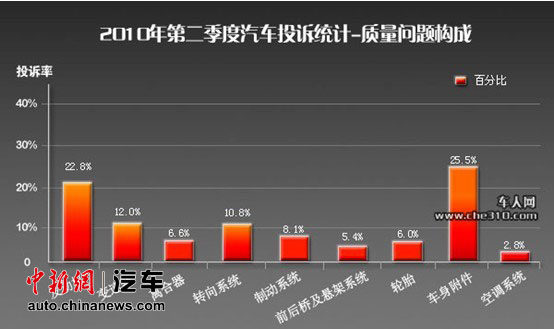 中新網(wǎng)7月12日電 近日,中國質(zhì)量協(xié)會(huì)用戶委員會(huì)汽車質(zhì)量與車人網(wǎng)聯(lián)合發(fā)布了2010年二季度中國汽車產(chǎn)品質(zhì)量與服務(wù)質(zhì)量投訴分析報(bào)告。在二季度汽車質(zhì)量問題投訴中,輪胎和空調(diào)問題的投訴上升明顯。