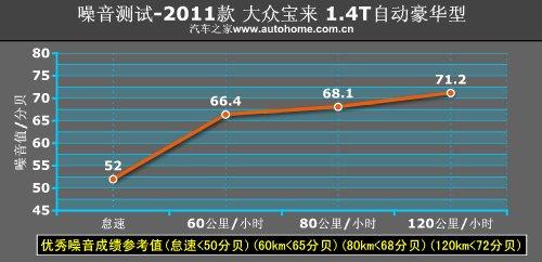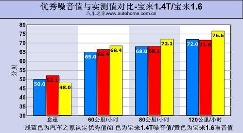 相信1.4T發(fā)動機配合7速DSG的行駛特性大家都比較了解,車動起來不過1200轉(zhuǎn)便從一擋切換至二擋,而之后的換擋動作也都在2000轉(zhuǎn)之內(nèi)(日常駕駛)完成,因此發(fā)動機噪音值會控制的很好,圖表中特意添加了之前測試的1.6L寶來的實測噪音值,可以看到除怠速之外都要比1.4T版本高出不少。美中不足的是與一些2.0L及更大排量的自然吸氣發(fā)動機相比,在高速行駛時這臺1.4T發(fā)動機傳到駕駛艙的某種震動的響聲還是能察覺到的。
