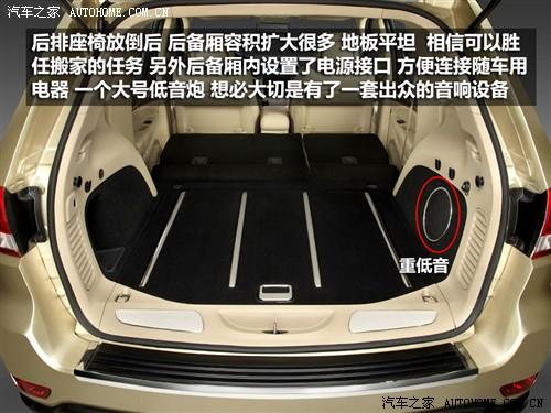 座椅放倒后空間后備廂空間得到很大擴(kuò)大,放倒后地板平整,我想可以勝任搬家的任務(wù),如果用作旅行,后備廂容積足以放下你所需的物品,不是還有車頂行李架呢嘛?后備廂還這是了一個(gè)電源接口,方便隨車用電器連接使用。另外在后備廂內(nèi)發(fā)現(xiàn)了一個(gè)尺寸不小的低音炮,相信新款大切可以給我們帶來(lái)不錯(cuò)的視聽(tīng)感受。