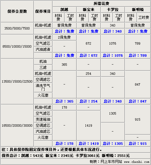 別克新凱越首保時間是四款車型中最短的,但廠家提供前兩次免費(fèi)保養(yǎng),這點(diǎn)看來還比較貼心。18500公里結(jié)算后,543元的總保養(yǎng)金額是四款車中最少的一個。新寶來和新明銳同為大眾品牌下車型,但由于合作商不同,保養(yǎng)的費(fèi)用還是存在一些細(xì)微的差距,都在2600元范圍內(nèi)。日系車一貫是經(jīng)濟(jì)實(shí)惠見長,但在后期保養(yǎng)的方面豐田卡羅拉的費(fèi)用卻是四款車中最高的,超過3000元的數(shù)字也是新凱越保養(yǎng)費(fèi)用的5倍多。