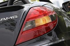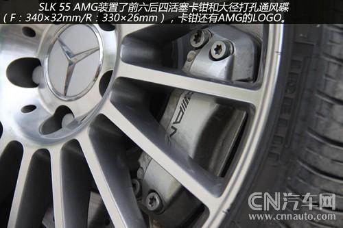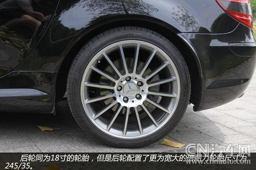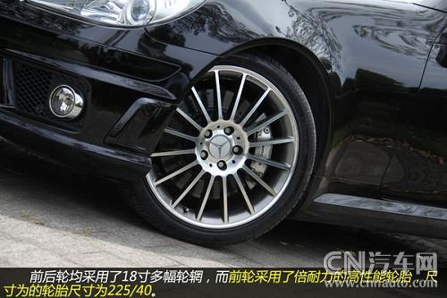 從輪轂以及剎車鉗都可以看到有AMG的標(biāo)識,可以看出這些都是AMG為SLK55重新打造得。配置18吋多幅式鋁圈的SLK55AMD,配用的輪胎是前225/40、后245/35/18P-Zero紅飆。煞車因動力和車重均較小之故,只裝置了前六后四活塞卡鉗+大徑打孔通風(fēng)碟(F:340×32mm/R:330×26mm),不過它的前碟中心盤采用了鋁合金的兩片式構(gòu)造,對于減輕簧下負(fù)重與抑制熱衰退肯定有正面的作用。