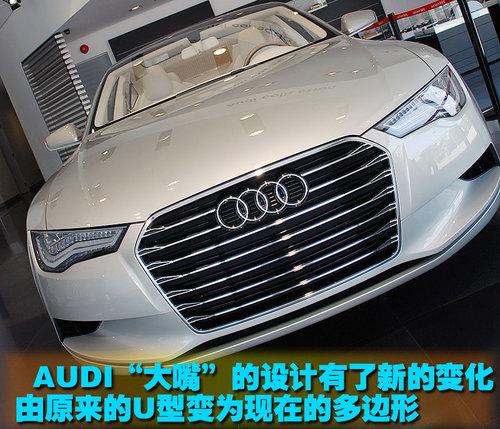 在正面特征上,概念車仍然具備奧迪標(biāo)志性的的“大嘴”進氣格柵。但是略加觀察您也會發(fā)現(xiàn)這款概念車的進氣格柵又目前國產(chǎn)A6L的U型改變?yōu)榱祟愃朴诙噙吿菪蔚男螤。而“奧迪四個圈”的LOGO位置也設(shè)計的比較靠上而不是中間或是下方。
