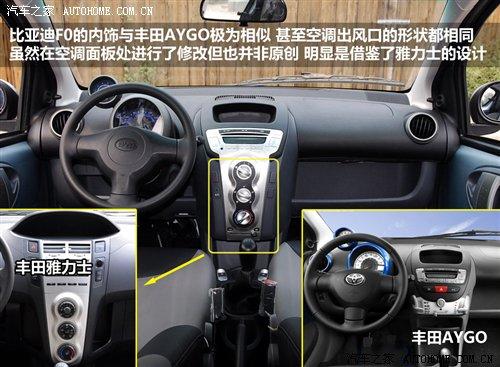 比亞迪F0是目前非常受歡迎的微型車(chē)之一,可愛(ài)靚麗的造型尤其吸引年輕人的目光,在整個(gè)微型車(chē)領(lǐng)域中的銷(xiāo)量也是名列前茅,當(dāng)然這與它親民的售價(jià)也是分不開(kāi)的,然而它俊俏的外表和可愛(ài)的內(nèi)飾卻與豐田旗下的兩款車(chē)有著極度的相似。
