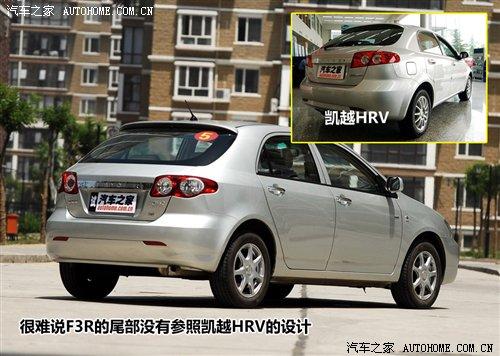 比亞迪F3的前臉與花冠也十分相似,大燈的形狀做了些小小的修改,尾燈則與上一代本田飛度三廂版的十分相像,個(gè)人覺得這款尾燈似乎與整體的平和中庸風(fēng)格并不太搭調(diào),只是看的時(shí)間長了已經(jīng)習(xí)慣了。除此之外,F(xiàn)3的兩廂車型F3R的尾部造型也與上海通用別克已經(jīng)停產(chǎn)的凱越HRV具有九成的相似。