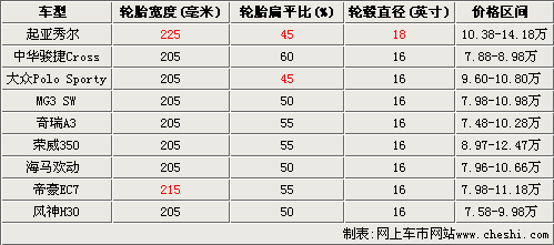 在以上車型之中,帝豪EC7系列全系都配備了215/55R16輪胎,各類尺寸參數(shù)都比較平均,所能影響的性能和舒適度在同級(jí)車中比較領(lǐng)先。另外,大眾Polo Sporty與秀爾一樣,是采用45較低扁平比的輪胎,提升了整車的運(yùn)動(dòng)氣質(zhì)。大體來看,奇瑞A3、榮威350等偏重家用的車型,輪胎扁平比都偏高,而海馬歡動(dòng)、MG3 SW等偏向運(yùn)動(dòng)的車型,扁平比則略低。
