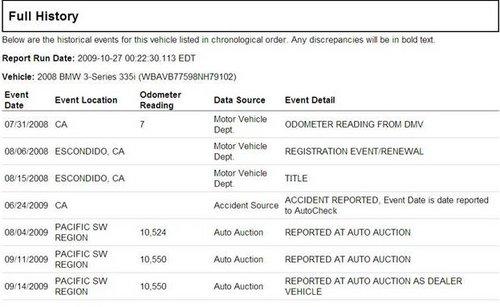 AutoCheck report與美國部份州的監(jiān)理所(DMV)有合作關(guān)系,因此如果您上美國監(jiān)理所(DMV)的網(wǎng)站,監(jiān)理所都會建議您在買車的時候,一定要檢查AutoCheck報(bào)告,在AutoCheck報(bào)告可能可以提供您買車的重要參考資料-如經(jīng)歷多少任車主,里程數(shù)為何,何時何地掛牌,是否有出過交通事故,車籍資料是否干凈(如Lemon car, Salvage or Junk title),等等歷史資料。另一份也一定要了解的是CarFax。