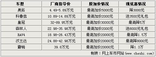 從上面統(tǒng)計(jì)的7款車型來(lái)看,其中皇冠創(chuàng)出最大差價(jià),上市之后曾最高加價(jià)3萬(wàn)元,而目前最高降幅已達(dá)5萬(wàn)元。而SUV車型也是市場(chǎng)加價(jià)的主力,森林人、RAV4、漢蘭達(dá)、霸銳等都在上市后出現(xiàn)加價(jià)情況,除森林人只有2000元之外,其他都普遍加價(jià)2萬(wàn)元,不過(guò)隨著市場(chǎng)競(jìng)爭(zhēng)的激烈,最高降幅已達(dá)1.5萬(wàn)元。