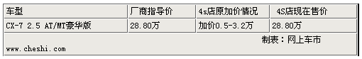 作為一款具有跑車化外觀和馬自達操控DNA的中型SUV,馬自達CX-7自去年11月上市以來一直備受關注。根據網上車市價格監(jiān)測系統顯示,自CX-7上市以來,各4S店一直持續(xù)提現車加價0.5萬-3.2萬元,而近期北京馬自達4S店出現了平價銷售現象,售價為廠商指導價28.8萬,少量現車供應。具體車型價格如下: