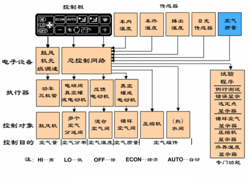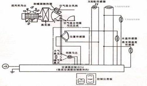 全自動溫度控制系統(tǒng)的組成包括溫度傳感器、控制系統(tǒng)ECU、執(zhí)行機構等。其中溫度傳感器有車外氣體溫度傳感器、車內氣體溫度傳感器、日照傳感器(陽光強度傳感器)和蒸發(fā)器溫度傳感器。