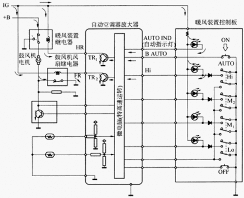 (1)鼓風(fēng)機(jī)轉(zhuǎn)速控制?照{(diào)系統(tǒng)ECU根據(jù)設(shè)定的溫度、車(chē)內(nèi)現(xiàn)有溫度、車(chē)外溫度、陽(yáng)光強(qiáng)度、蒸發(fā)器皿溫度等信號(hào),發(fā)送不同的指令給鼓風(fēng)機(jī)電機(jī),并使之搭鐵,從而控制不同的鼓風(fēng)機(jī)轉(zhuǎn)速。對(duì)于一些恒溫空調(diào)系統(tǒng),當(dāng)發(fā)動(dòng)機(jī)啟動(dòng)時(shí)或冷卻液溫度低于預(yù)定值,空調(diào)系統(tǒng)ECU使鼓風(fēng)機(jī)不起作用。