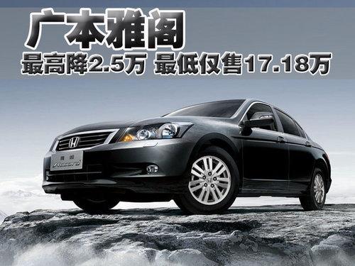 當提到中級車型大家也許會不約而同的想起廣本雅閣,新雅閣憑借其大氣的外觀、舒適的空間和豪華的配置對于中級轎車市場的構(gòu)成起到了舉足輕重的作用。去年,廣汽本田又對第8代雅閣進行了小改款,對原來車型的配置有一定程度提升,部分車型增加了智能鑰匙和后遮陽板等配置,提高了雅閣整體車型的性價比。近日根據(jù)網(wǎng)上車市價格監(jiān)測系統(tǒng)顯示,目前雅閣現(xiàn)金最高優(yōu)惠2.5萬元,最低售價逼平17萬。具體價格以及優(yōu)惠幅度如下: