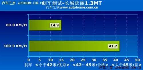 長城汽車的剎車一直得到較高的評價(jià),我們對1.3L車型進(jìn)行的剎車測試中,車輛全力剎車,車速從100-0KM/h的最短制動(dòng)距離為41.7米,系統(tǒng)的穩(wěn)定性處于中等水平,剎車成績還是不錯(cuò)的,我們比較滿意。