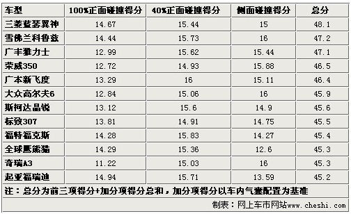 通過以上表格,我們可以看出這樣一個(gè)現(xiàn)象,12款車當(dāng)中涉及自主品牌、日韓系列和德美系列各國車型。很多人一直堅(jiān)信德美系的車要比其他兩類車要結(jié)實(shí),但事實(shí)證明他們的成績也并非那么無懈可擊?磥鞢-NCAP的鐵證也可以做一回流言終結(jié)者了,不過這12款車全部達(dá)到了45分以上,也就是C=NCAP五星級安全標(biāo)準(zhǔn)。至于傳說中的五星半級別,在比較常見的國產(chǎn)車中只有雅閣和CR-V達(dá)到。