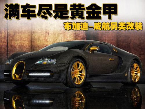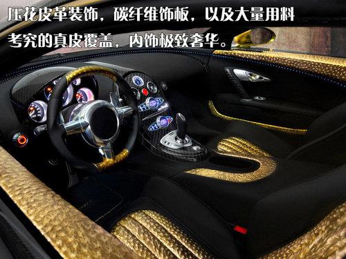你一定已經(jīng)注意到那個(gè)令人難以置信的散發(fā)出淡淡金色光芒的車身外觀,采用特殊的碳纖織物改裝而成。從經(jīng)典的布加迪門拱型進(jìn)氣格柵、雙叉內(nèi)旋五輻車輪、油箱蓋、門把手以及貫穿車身的裝飾條等鍍金件,更添了布加迪的奢華感。