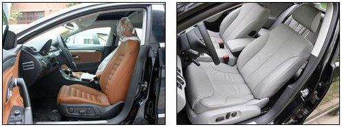 座椅方面同樣體現(xiàn)出了兩款車型不同的設(shè)計理念,CC豪華版的棕色波浪式座椅,看起來包裹性出色,側(cè)向給予的支持力也還算到位,如果您另對黑色座椅鐘愛尤佳,那么選裝Alcantara材質(zhì)拼裝的翻毛真皮座椅一定會是個更好的選擇。邁騰淺色的內(nèi)飾看起來更加厚重,偏向家用風(fēng)格,坐上去感覺包裹性一般,但真皮座椅質(zhì)地還算比較不錯。