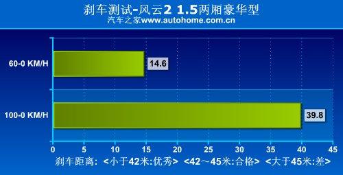 我們對(duì)風(fēng)云21.5L兩廂豪華型進(jìn)行的性能測(cè)試中顯示,從100KM/h全力制動(dòng)到車輛靜止,剎車距離為39.8米,成績非常出色;剎車踏板回饋力較大,所以在剎車時(shí)需要使用更大力氣,在日常駕駛中踏板的余量偏大,不過一旦深踩,制動(dòng)效果明顯。
