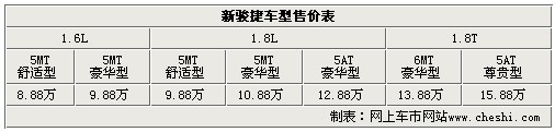 新駿捷各車型售價分別為,1.6舒適型8.88萬、1.6豪華型9.88萬、1.8舒適型9.88萬、1.8豪華型10.88萬、1.8自動豪華型12.88萬、1.8T6MT豪華型13.88萬以及1.8T5AT尊貴型15.88萬。據(jù)華晨汽車經(jīng)銷商處銷售人員介紹已經(jīng)開始接受客戶預(yù)定,展車已經(jīng)到店,有購買意向的消費(fèi)者可以到店賞車。