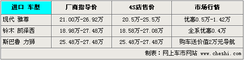 在20—30萬的價格區(qū)間內(nèi),可以說進口中級車的可選擇性并不是很多,目前銷量較為突出的則是斯巴魯?shù)牧Κ{車型,目前購買可獲贈車載導(dǎo)航,而新推出不久的鈴木凱澤西在配置上相當(dāng)完備,近期購買可獲得4千元的優(yōu)惠,進口現(xiàn)代雅尊則是少數(shù)人的偏愛,但在優(yōu)惠幅度上最高,優(yōu)惠后最低僅售20.5萬元。