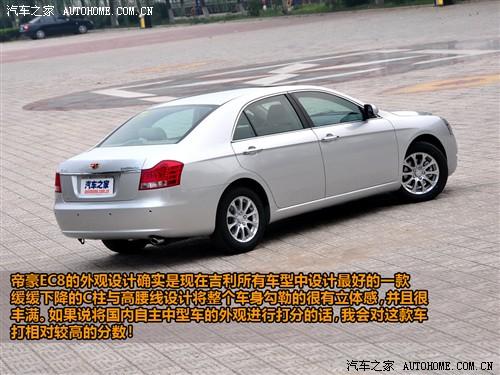 剛才說完了我對這款車的第一印象,下面我再和你說說我的第二印象:漂亮。請不要認為我是帝豪的車托,因此當(dāng)你見到帝豪EC8的時候也會對這款車的優(yōu)美的外形設(shè)計感到贊嘆。特別是從尾部以45°角看的時候更會讓你覺得它的線條很優(yōu)美。此外,帝豪EC8的C柱設(shè)計的特別厚實且平緩,這樣就與后備箱很好的融合在一起。