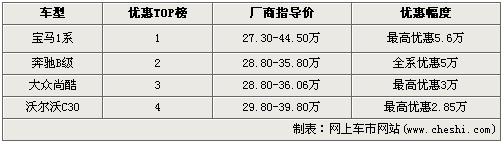 看完排行榜匯總表后不難發(fā)現(xiàn),定位于30萬上下的進(jìn)口緊湊級別車型日子似乎都不太好過,全部都有2萬以上的優(yōu)惠幅度。其中優(yōu)惠幅度最高的車型是寶馬1系,最高優(yōu)惠5.6萬,全新上市的運動限量版也有1.9萬元優(yōu)惠,該款車型全國限量480臺,性價比表現(xiàn)不錯。優(yōu)惠最少的是沃爾沃C30,一款個性突出的兩門緊湊車型,最高優(yōu)惠2.85萬元。