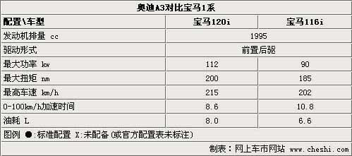 與奧迪剛剛在國內(nèi)投放的1.4T引擎的A3相比,寶馬116的發(fā)動機(jī)動力方面與1.4T的奧迪A3基本相當(dāng)。兩款車型的各項技術(shù)參數(shù)例如加速時間、油耗表現(xiàn)也處于相近的水平上,可以說BMW 116i恰好可以在價位以及動力上滿足消費者的需求。目前奧迪A3 1.4T入門車型的價格是26.8萬元,如果未來BMW 116i的官方定價與我們的預(yù)測接近,那么25萬元左右的價格加上2.0升排量和后輪驅(qū)動,絕對稱得上是奧迪A3的勁敵。