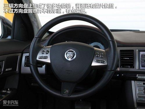 三輻方向盤上集成了很多功能鍵,背面還有撥片換擋,當(dāng)然,這并不值得大肆稱道,一切都因?yàn)檫@是XFR。如果以駕駛者的角度來挑問題的話,我會(huì)嫌方向盤不夠厚重,主要體現(xiàn)在握感上,此時(shí)我不由得開始懷念自己車上的R36方向盤。