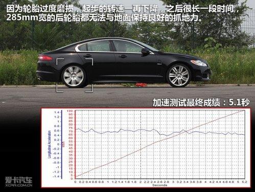 當(dāng)進(jìn)行加速測(cè)試時(shí),按慣例我們會(huì)阻止所有電子系統(tǒng)介入,將轉(zhuǎn)速維持在發(fā)動(dòng)機(jī)最佳發(fā)力區(qū),在起步的瞬間使輪胎處于滑與不滑的臨界點(diǎn),之后全力沖刺。不過(guò)很抱歉,經(jīng)過(guò)多次嘗試,我們無(wú)法令XFR獲得最佳的起跑狀態(tài),原因就是因?yàn)檩喬ミ^(guò)度磨損,起步的轉(zhuǎn)速一再下降,而順利起步之后很長(zhǎng)一段時(shí)間,285mm寬的后輪胎都無(wú)法與地面保持良好的抓地力。通過(guò)加速曲線(xiàn)圖也可以看出,起步后接近1秒的時(shí)間,加速度都不高,有時(shí)還處于下降狀態(tài),最終5.1秒的加速成績(jī)并不是XFR的最強(qiáng)能力。