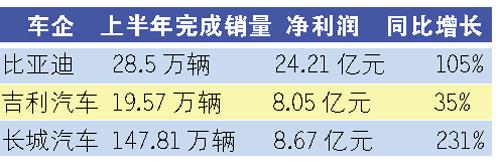 受益于上半年車市的產(chǎn)銷兩旺,三大車企的業(yè)績?nèi)飄紅,其中長城汽車取代比亞迪成為業(yè)績增長最迅速的民營車企,吉利汽車忙于整合沃爾沃轎車業(yè)務(wù),暫時(shí)沒有突出表現(xiàn)。