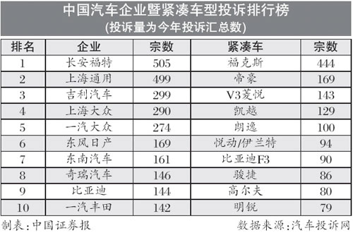 汽車投訴網(wǎng)本期投訴榜上榜企業(yè)與上周相比再次出現(xiàn)變動(dòng),比亞迪、一汽豐田分別以144宗和142宗取代東風(fēng)雪鐵龍、長(zhǎng)城汽車進(jìn)入前十大名單。而長(zhǎng)安福特更是以16宗的增量一舉超越上海通用,首次成為企業(yè)投訴榜“冠軍”。