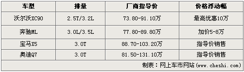 表中顯示清晰,沃爾沃XC90是四款車型中唯一一款出現(xiàn)優(yōu)惠的車型,三個版本全部優(yōu)惠10萬元,性價比表現(xiàn)比較突出;奔馳ML是四位對手中唯一一款加價車型,根據(jù)車型不同加價5-8萬元。寶馬X5和奧迪Q7銷售情況相對穩(wěn)定,以廠商指導(dǎo)價銷售,但Q7 3.0TFSI等等時間較長,有5個月之多。