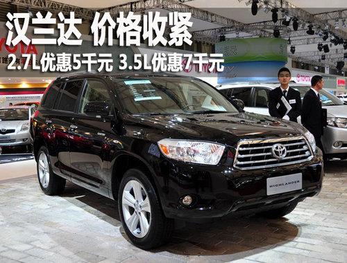 廣汽豐田生產(chǎn)的漢蘭達Highlander于2009年5月25日正式下線,擁有2.7L和3.5L兩個排量共10款車型,價格區(qū)間為24.88~42.98萬元。近期,編輯從北京廣汽豐田4S專營店獲悉,漢蘭達現(xiàn)車充足,優(yōu)惠幅度有所縮水,現(xiàn)金讓利最高7千元。詳情見下表: