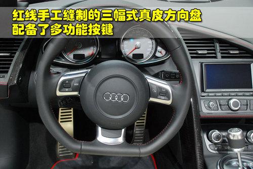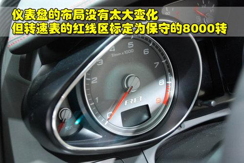奧迪R8 4.2L敞篷版采用的是紅線手工縫制的三幅式真皮方向盤,并且配備了多功能按鍵。儀表盤的布局與5.2L車型并沒(méi)有太多變化,但由于引擎動(dòng)力的減弱,轉(zhuǎn)速表的紅線區(qū)標(biāo)定為相對(duì)比較保守的8000轉(zhuǎn)。