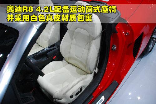 奧迪R8 4.2L敞篷版配備了運(yùn)動(dòng)型筒式座椅,并采用了白色真皮材質(zhì)包裹,與內(nèi)飾的整體色調(diào)相反,看上去個(gè)性鮮明。這款新車的座椅以及靠背兩側(cè)都比較突出,對(duì)身體的包裹性非常不錯(cuò),而且也采用了8向電動(dòng)調(diào)節(jié)功能,方便駕駛員或乘員調(diào)整到最合適的坐姿。