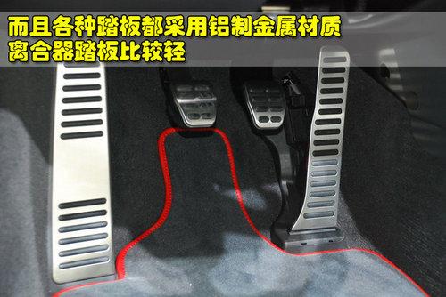 奧迪R8 4.2L敞篷版由于標(biāo)配的是六速手動(dòng)變速箱,油門、剎車以及離合器踏板都是采用輕量化的鋁制金屬材質(zhì),而且還配備了左腳休息踏板,離合器踏板的力度比較輕,但看上去制動(dòng)踏板有些偏小,并沒有經(jīng)過特殊的設(shè)計(jì)。