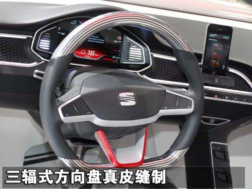 西亞特IBE概念車采用的三輻式運動型方向盤設計,灰色格調下配有紅色點綴,很有性能車的感受,材質上采用真皮縫制手感會非常不錯。
