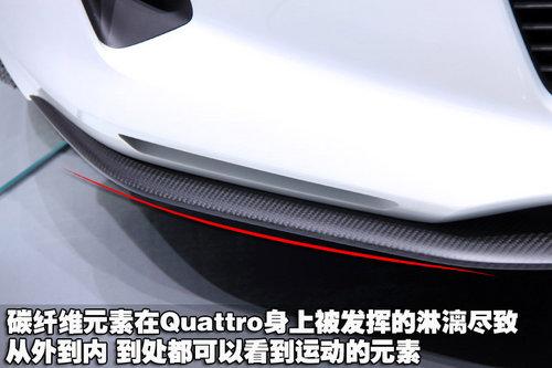 碳纖維元素在奧迪Quattro概念車身上隨處可見,車頭部位只是低調(diào)的在小包圍上用到了這一元素,等一會到車尾和內(nèi)部,大家就會認可隨處可見這個詞,因為,奧迪Quattro概念車身上真的配備了很多碳纖維面板。