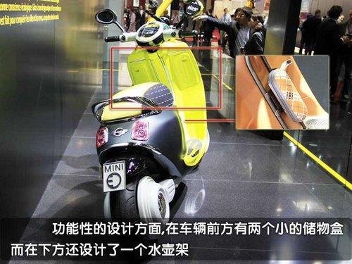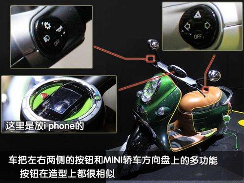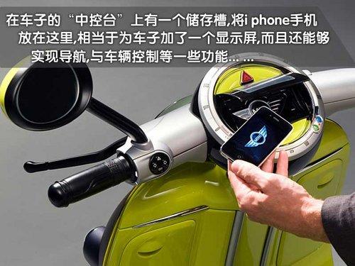 MINI Scooter E概念車將i phone手機(jī)與電動(dòng)車融合,通過(guò)位于車輛頂端的專用接口。車主的i phone手機(jī)可以放置于其中,與車輛的音響和信息與了系統(tǒng)實(shí)現(xiàn)最大化的兼容。此外,還有一項(xiàng)有趣的功能,可以通過(guò)谷歌地圖來(lái)顯示其它騎車者的位置,甚至可以發(fā)出結(jié)伴而行的邀請(qǐng)。