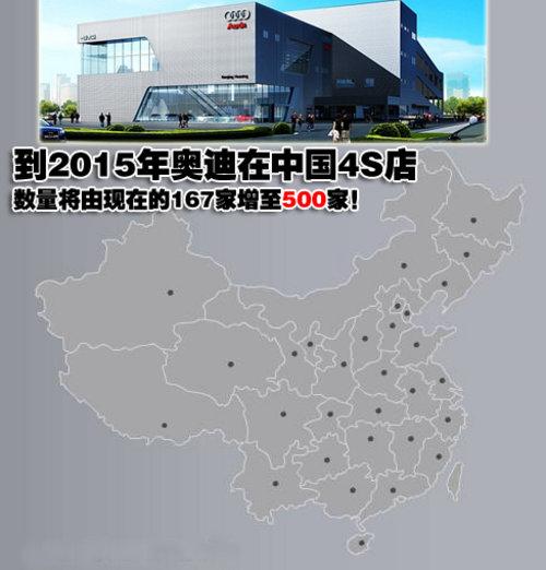 奧迪在國內(nèi)的熱銷使得現(xiàn)有的經(jīng)銷商在數(shù)量方面已經(jīng)不能滿足日益發(fā)展的需要,為了更好的為客戶服務(wù),奧迪在未來將持續(xù)提升經(jīng)銷商網(wǎng)絡(luò)的數(shù)量和質(zhì)量。預(yù)計(jì)到2015年,奧迪在國內(nèi)的經(jīng)銷商數(shù)量將從目前的167家上升到500家,覆蓋大部分中國主要城市,讓客戶更便捷的能享受到周到的服務(wù)。