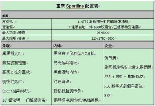 動力方面,寶來Sportline搭載1.4TSI發(fā)動機,其最大輸出功率130PS/5000rpm,峰值扭矩220Nm/1750-3500rpm,在變速器方面,寶來Sportline有7擋DSG雙離合自動變速器和5擋手動變速器兩種選擇。
