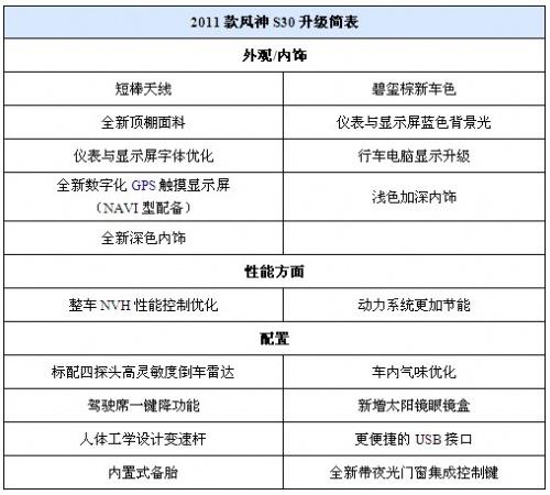 新車看點:2011款風神S30只是做了一些簡單的改變和升級,售價并沒有增加,另外改進了一些老款車型上出現(xiàn)的瑕疵。