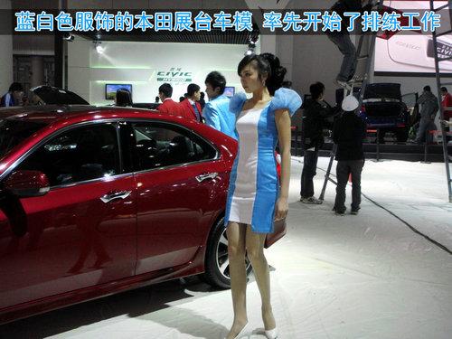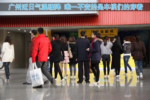 車模的誘惑力往往更大,雖然距離車展還有2天,但她們已經(jīng)開始了排練試演,于此同時在她們身后的一些車輛卻成了陪襯。外近日廣州的氣溫驟降,白天大約在10幾度,許多人增添了較厚的衣服,但車模們依舊短裙出鏡。