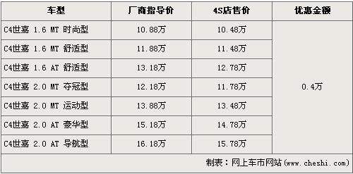 C4世嘉是東風雪鐵龍于2008年7月28日發(fā)布的去年第二款新車,廠商指導價為10.88萬-16.88萬元。今年的4月6日,東風雪鐵龍又為C4世嘉添加了2.0L手動奪冠版車型,致使C4世嘉車型增加到了7款。近日根據(jù)網(wǎng)上車市價格監(jiān)測系統(tǒng)顯示,C4世嘉目前全系優(yōu)惠4000元,具體車型售價見下表: