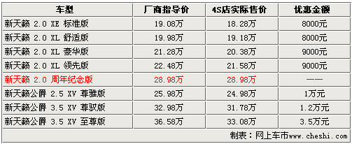 2009年6月16日,東風(fēng)日產(chǎn)推出了新天籟周年紀(jì)念版車(chē)型,售價(jià)為28.98萬(wàn)。這款新車(chē)是在天籟2.5L車(chē)型的基礎(chǔ)上,增加了BOSE5.1ch環(huán)繞音響系統(tǒng)和超大型雙層全景天窗等舒適性配置,大大提升了這款車(chē)的性價(jià)比。近日,記者在走訪北京地區(qū)的東風(fēng)日產(chǎn)4S店時(shí)了解到:目前新天籟周年紀(jì)念版還沒(méi)有現(xiàn)車(chē)到店,目前預(yù)定的消費(fèi)者將在7月底提到現(xiàn)車(chē)。