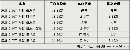 北京現(xiàn)代途勝是SUV市場(chǎng)銷售時(shí)間比較長(zhǎng)的一款車型,在經(jīng)過(guò)09款車型升級(jí)后,配置上有一定的提升,整體的性價(jià)比相對(duì)老款有提升。目前途勝全系車型優(yōu)惠的幅度均在萬(wàn)元以上,具體車型以及價(jià)格如下:
