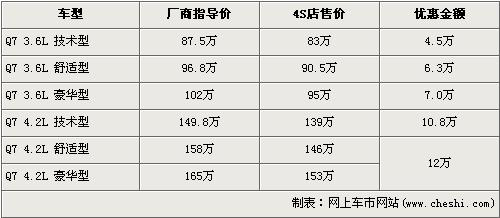 據(jù)銷售人員介紹,奧迪Q7分為3.6L和4.2L兩種排量共7款車型,目前全系最高優(yōu)惠為12萬(wàn)元。3.6L車型最高優(yōu)惠7萬(wàn)元,其中最低配的技術(shù)型優(yōu)惠后售價(jià)降到了83萬(wàn)元,3.6L舒適型售價(jià)降到了90.5萬(wàn)元,3.6L豪華型售價(jià)95萬(wàn)。排量更大的4.2L車型優(yōu)惠最高更是達(dá)到了12萬(wàn)元,4.2L舒適型售價(jià)降到146萬(wàn)元,4.2L豪華型售價(jià)降到了153萬(wàn)。