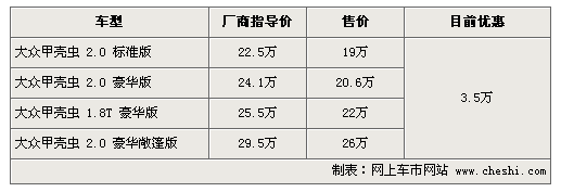 據(jù)4S店銷售人員介紹:目前甲殼蟲全系可優(yōu)惠3.5萬元,2.0標準版售價僅為19萬,但目前硬頂版甲殼蟲無現(xiàn)車,訂車需等半個月至兩個月。敞篷版目前現(xiàn)車較充足,喜歡的朋友可以不必等待漫長的訂車時間。