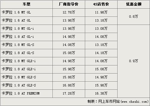 卡羅拉是一汽豐田于旗下的主力經(jīng)濟型轎車,上市后憑借著時尚的外觀贏得了消費者的喜愛?_拉全系共有5款車型,排量分為1.6L、1.8L,價格區(qū)間為13.28萬元-17.98萬元。前段時間,豐田官方對卡羅拉全系下調(diào)了廠商指導價,最高下降了9000元。近日根據(jù)網(wǎng)上車市價格監(jiān)測系統(tǒng)顯示,近期在經(jīng)銷店購買卡羅拉車型的消費者,可以得到最高9000元的優(yōu)惠,具體詳情請看下表: