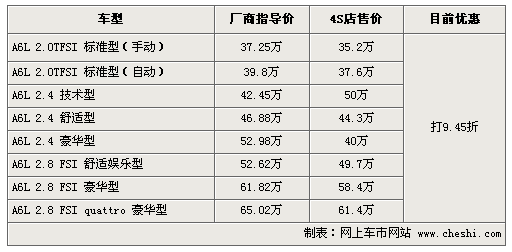 據(jù)4S店銷售人員介紹:目前奧迪A6L車系全部打9.45折,售價在35.2萬至61.4萬之間。但2.0TFSI基本型與3.0TFSI豪華型無車,也不接受預訂。車身顏色方面,黑色是A6L的主打色,同樣顏色也較齊全,除了上兩款車型無車外,其它車型現(xiàn)車充足。