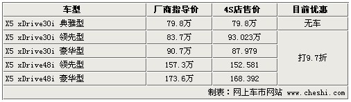 據(jù)4S店銷售人員介紹:目前寶馬X5除3.0升典雅型無車外,其它車型可打9.7折,最大優(yōu)惠達(dá)5.2萬元之多。但是目前X5無現(xiàn)車,預(yù)定最短需等一個半月,4.8升車型最長需等半年。雖然目前X5優(yōu)惠幅度較之前有所縮水,但目前無現(xiàn)車的狀態(tài)能有小幅優(yōu)惠也算是一個小的驚喜。