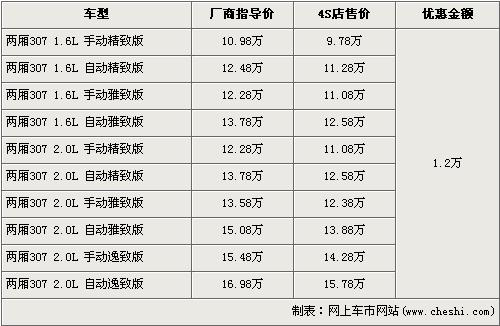 據(jù)東風(fēng)標(biāo)致經(jīng)銷店銷售人員介紹,兩廂標(biāo)致307分為1.6L和2.0L兩種排量,目前全系優(yōu)惠1.2萬元,入門車型的1.6L 手動精致版原廠商指導(dǎo)價為10.98萬元,經(jīng)優(yōu)惠后僅售9.78萬元,排量稍大的2.0L排量的低配車型手動精致版經(jīng)優(yōu)惠后售價為11.08萬元。